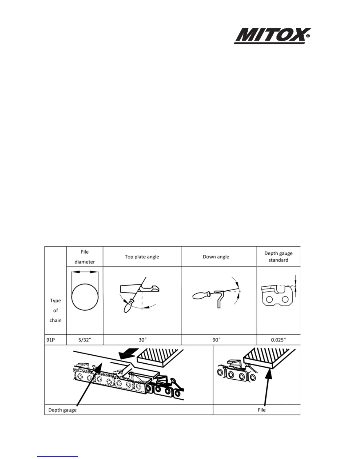 • Sharpen chain with a 5/32 (4mm) file and holder (Oregon part number 16265) / Sharpening kit