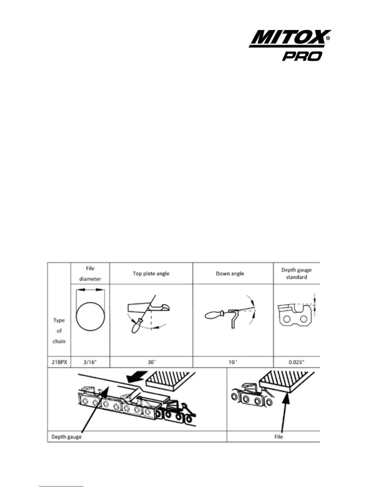 • Sharpen chain with a 3/16 (4.8mm) le and holder (Oregon part number 18228) / Sharpening kit