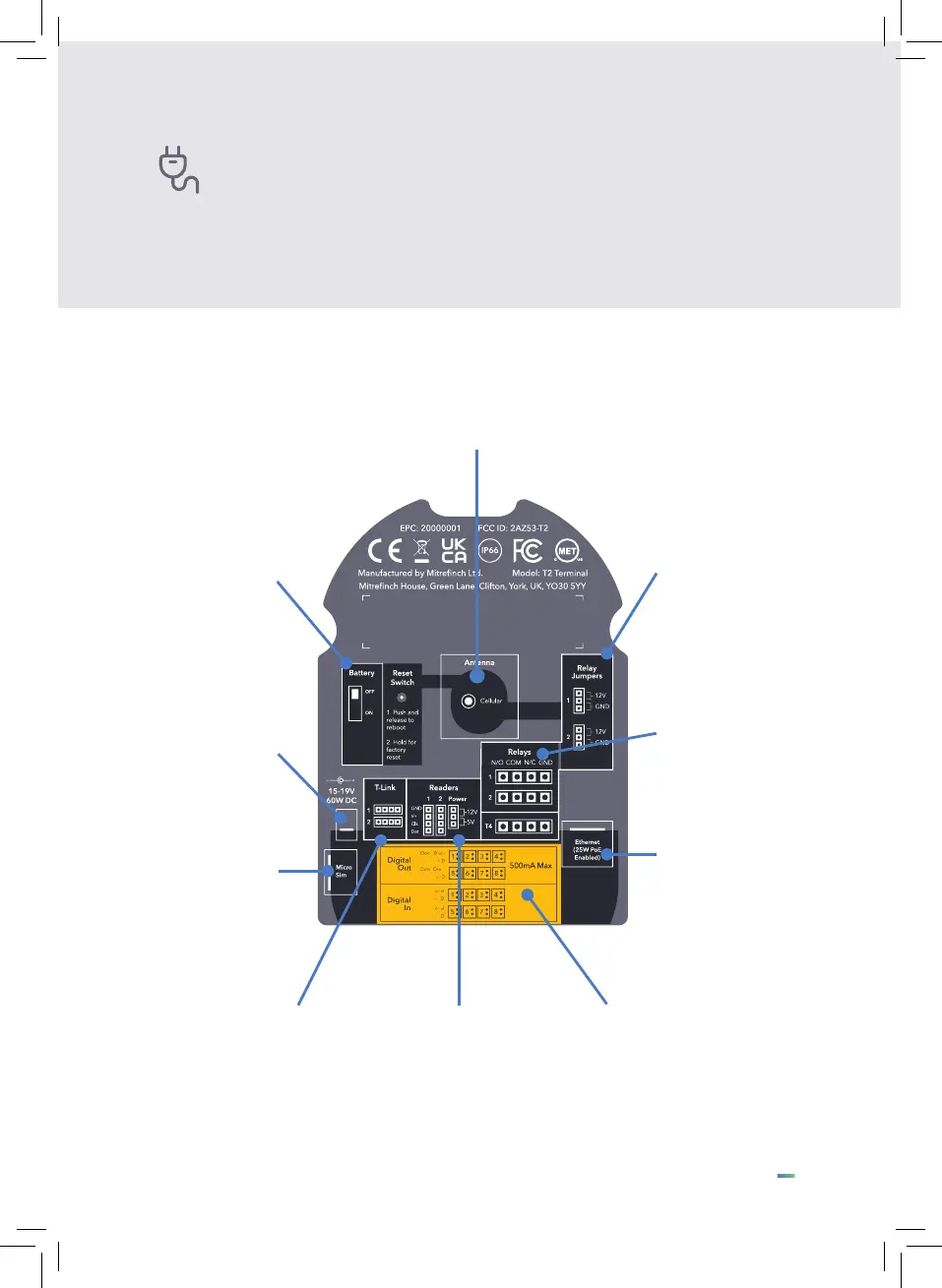 On the back of the T2 is an illustrative sticker detailing the connections on the unit. The