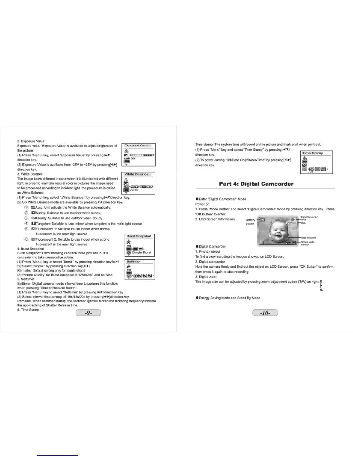 Mitsuba DSC - Digital Camcorder; Exposure; Burst Snapshot; White Balance