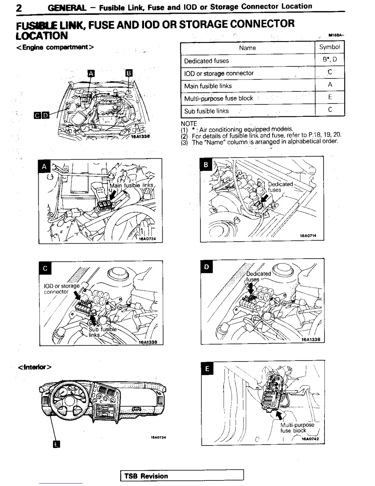 Mitsubishi Electric 1992 Eclipse - Fusible Link, Fuse and IOD or Storage Connector Location; Engine Compartment Fuse and Connector Locations; Interior Fuse and Connector Locations