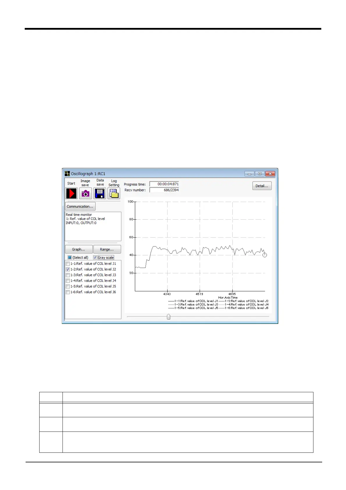 3 Run the program and monitor the value of “Ref. value of COL level” of the oscillograph function in the target