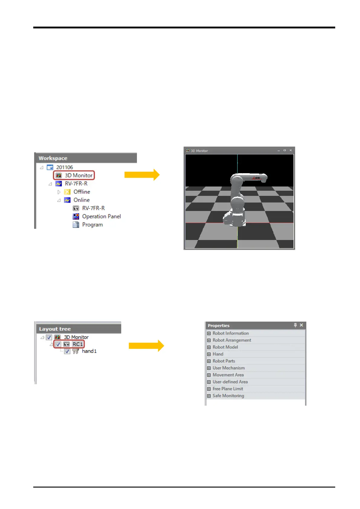 The 3D Monitor screen of RT ToolBox3 enables viewing shape models of the robot and tools and the area settings