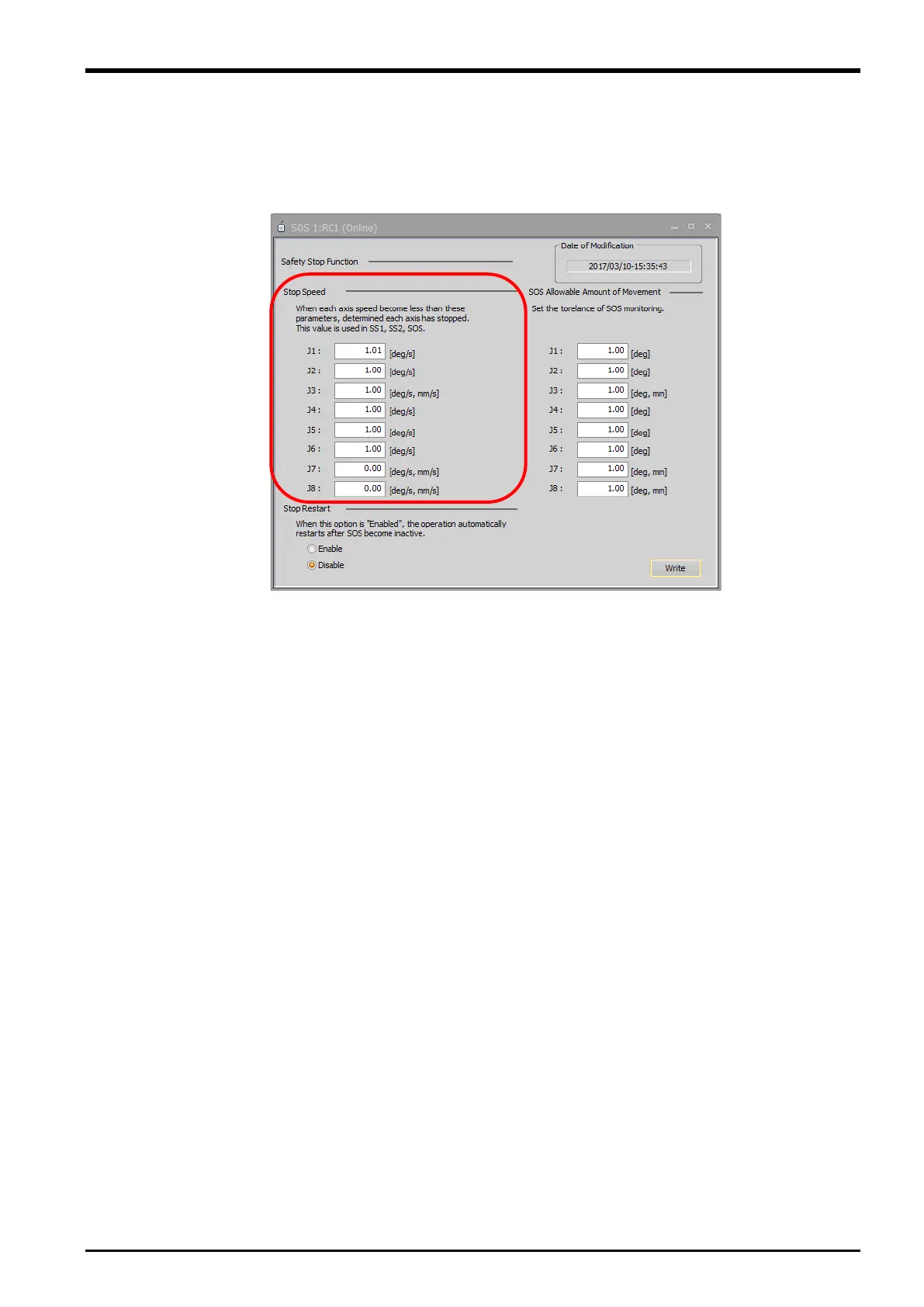 option] -> [SOS]. Then, in the Stop Speed fields, enter speeds at which the motors are judged to have stopped.