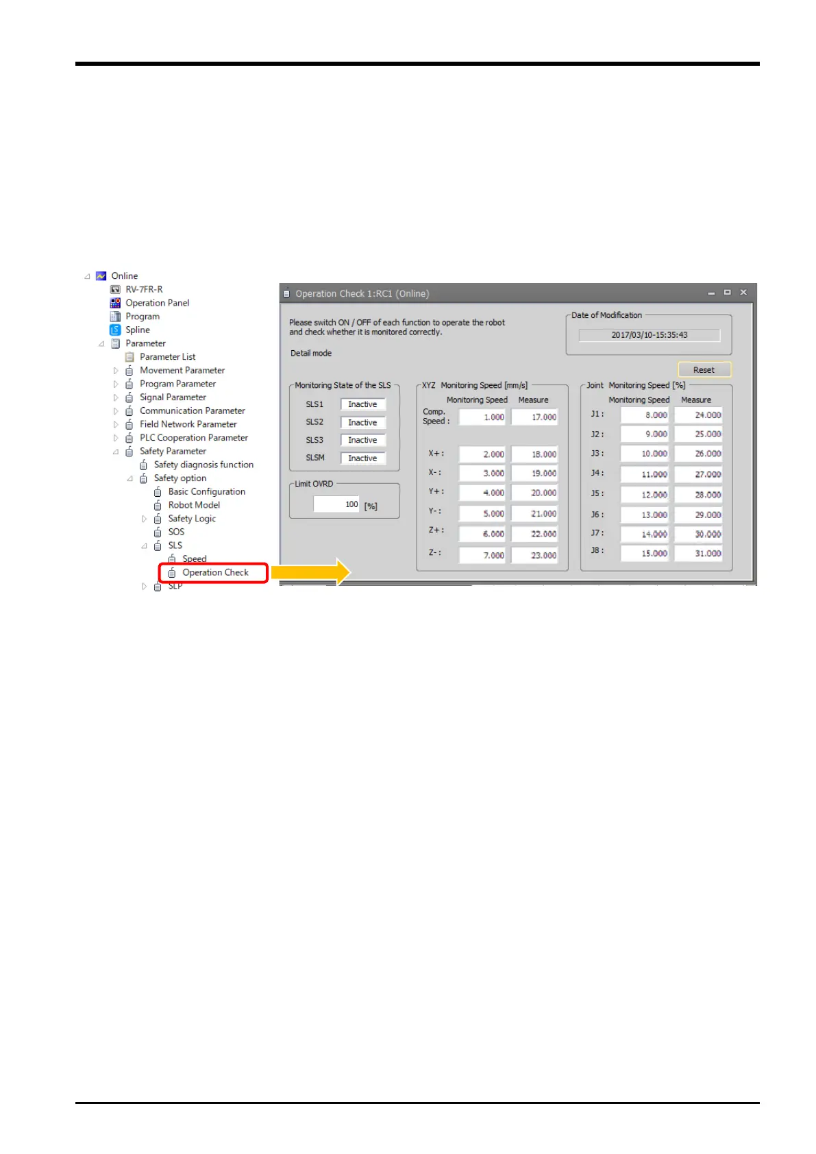 Parameter] -> [Safety option] -> [SLS] -> [Operation Check] and check the SLS monitoring state and speed