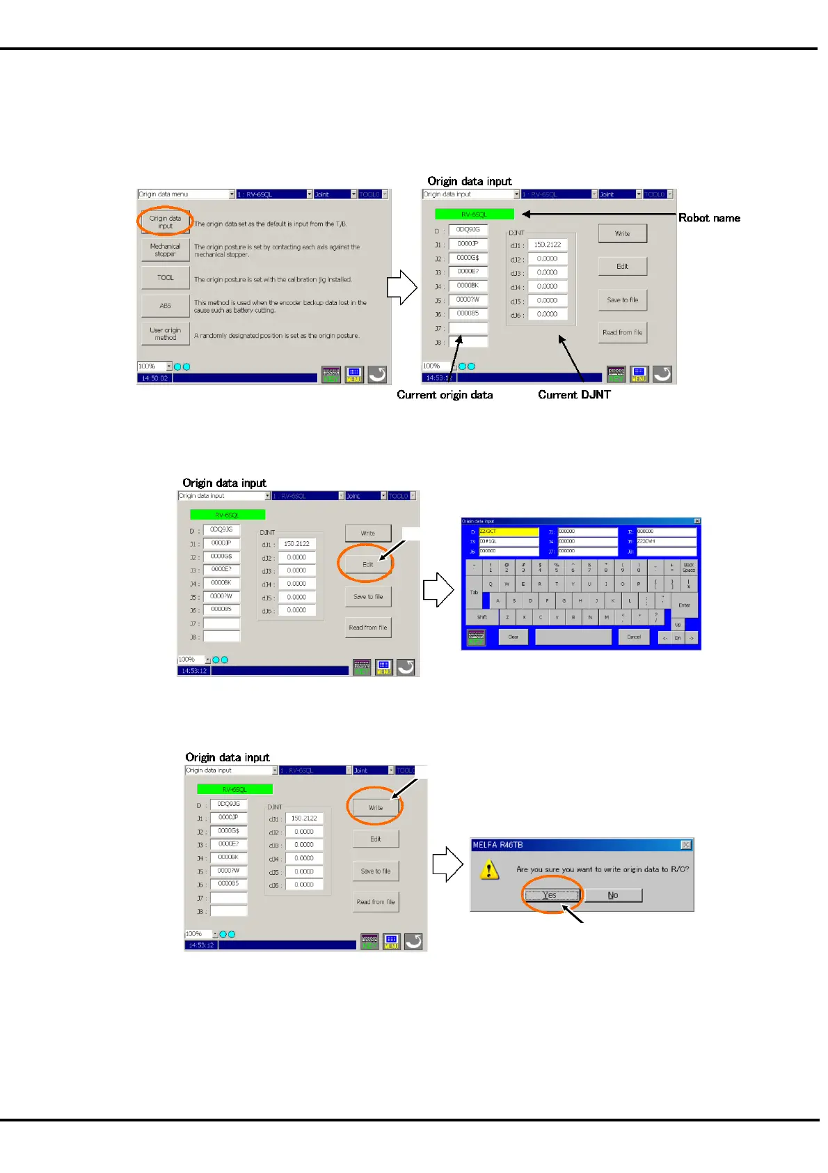 The origin data to be input is noted in the origin data sheet enclosed with the robot arm, or on the origin data