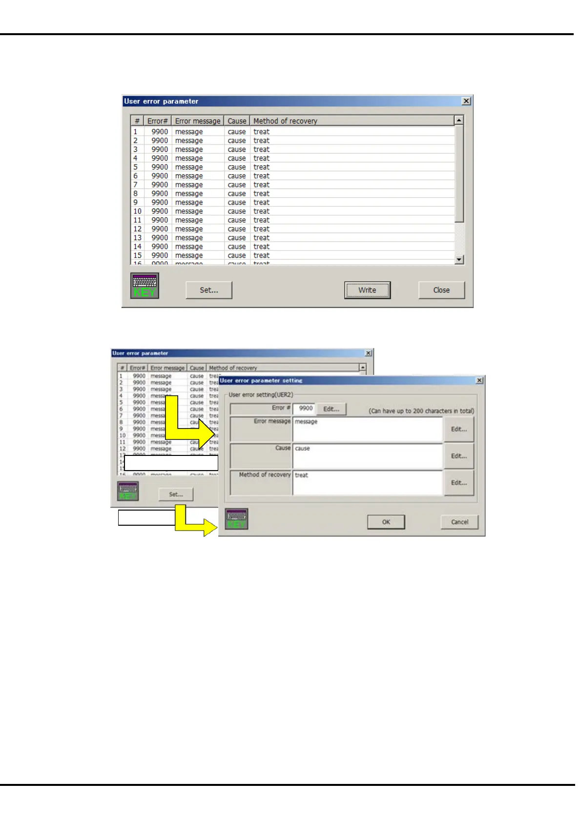 Double tap the error number from the list or tap [Set...] button. The "User Error" edit screen is displayed.