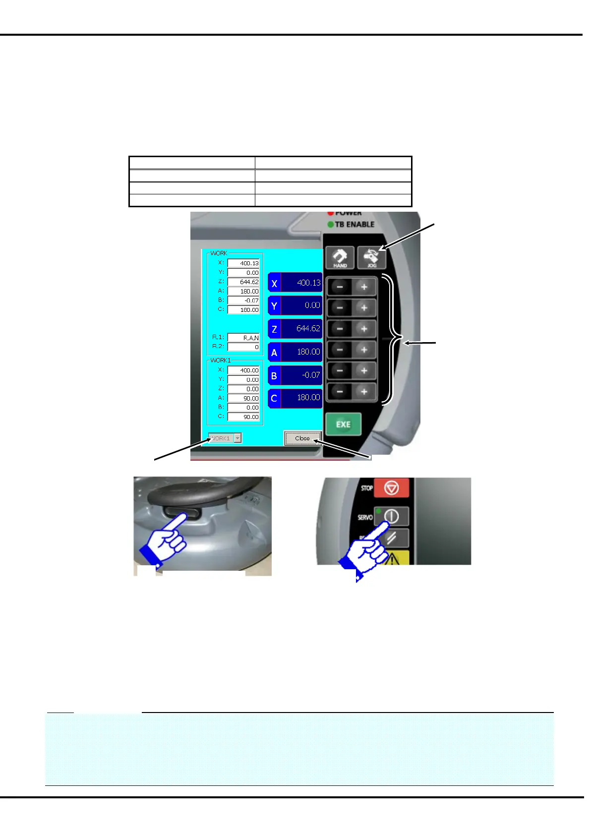 If the button corresponding to the axis to move is pushed, only while pushing, the robot will move.
