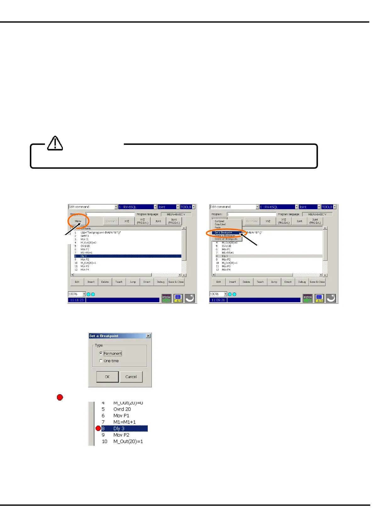 You can set breakpoints in the Command editing screen when editing the program in the Robot controller.