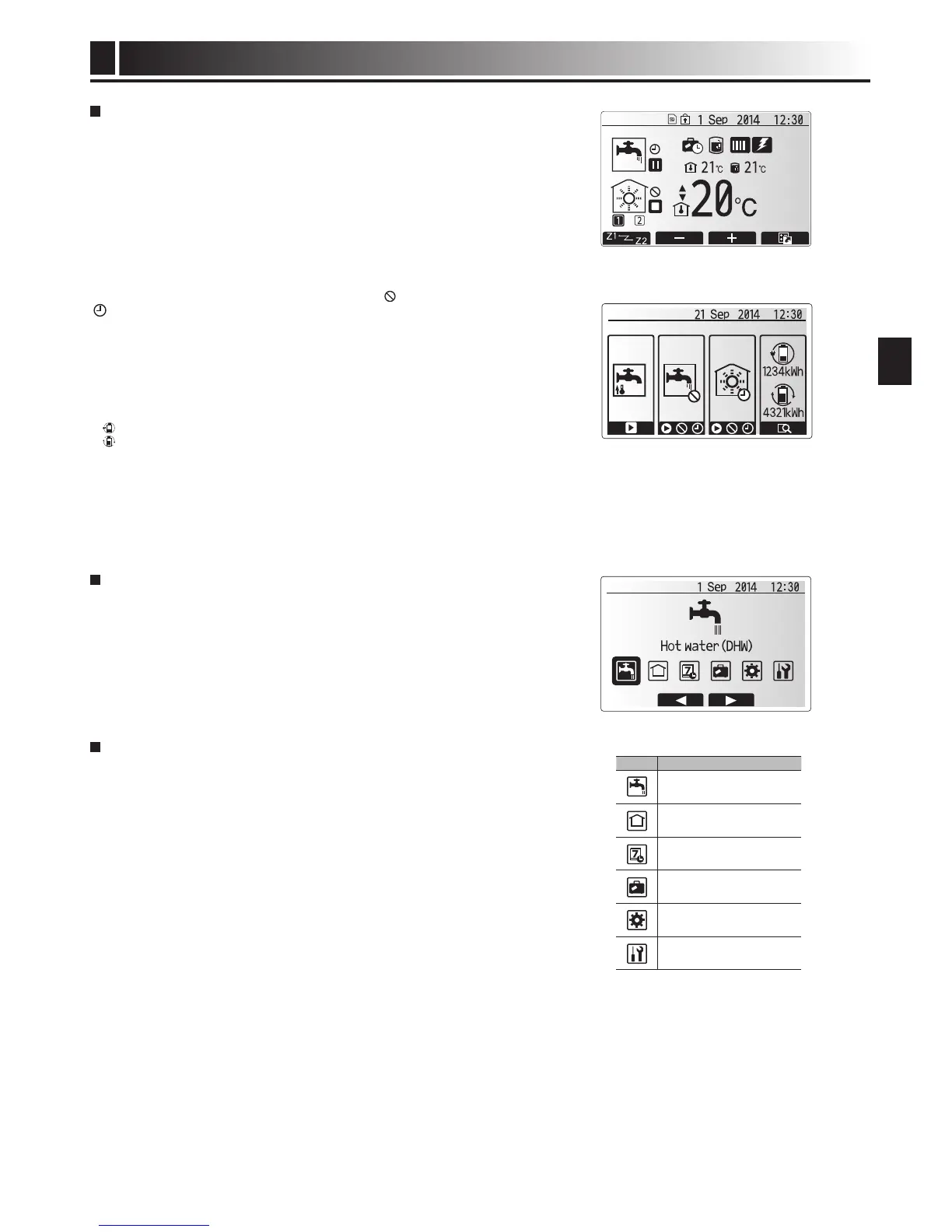 This screen shows the target temperature, space heating mode, DHW mode (if