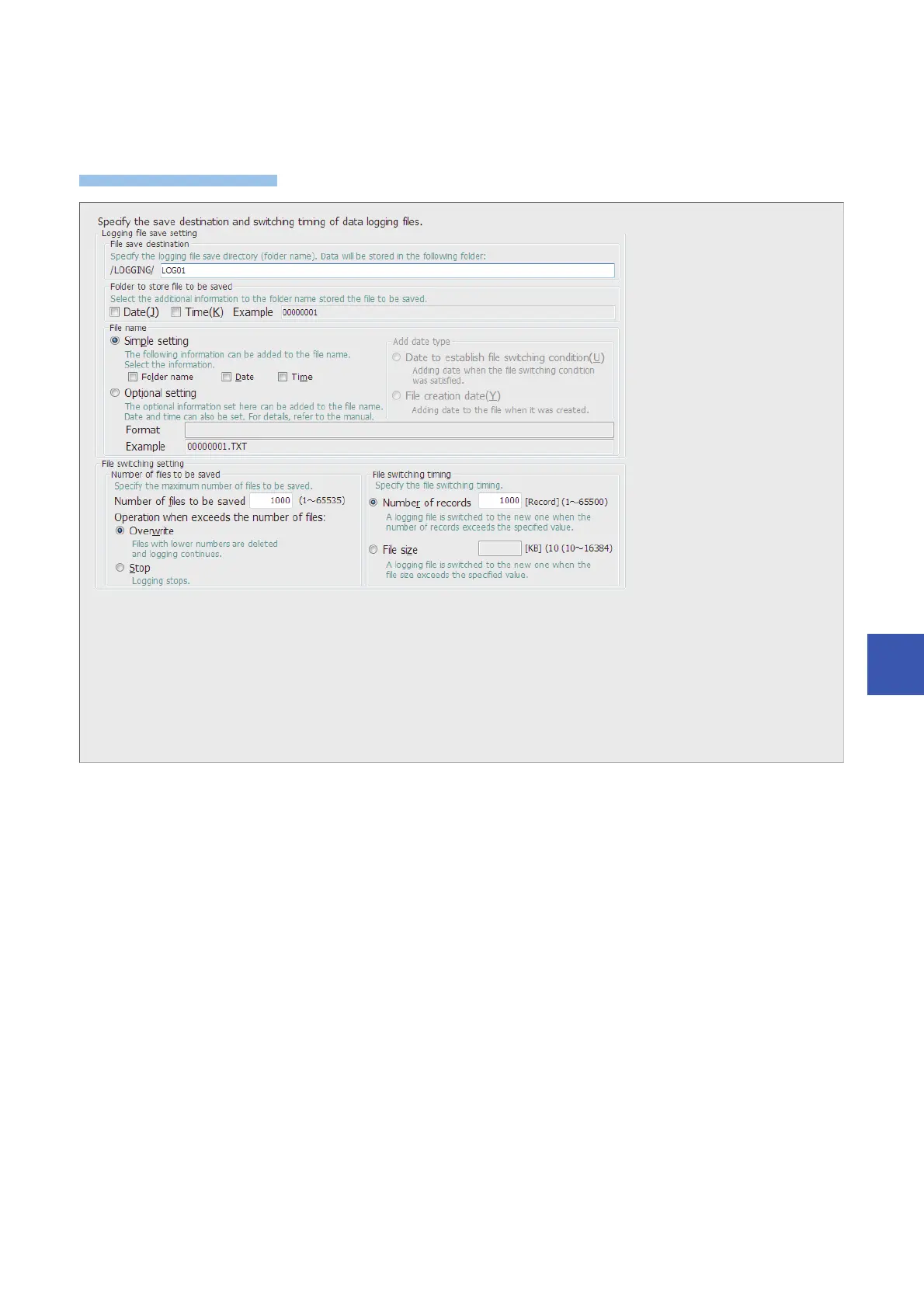 The following window configures the storage destination of data logging files and the switching timing of storage files. (