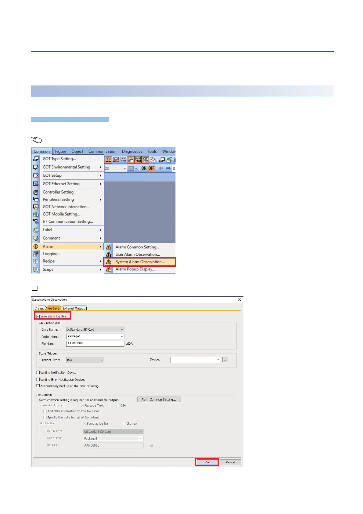 Configure the settings in GT Designer3 to create alarm log files of the GOT.
