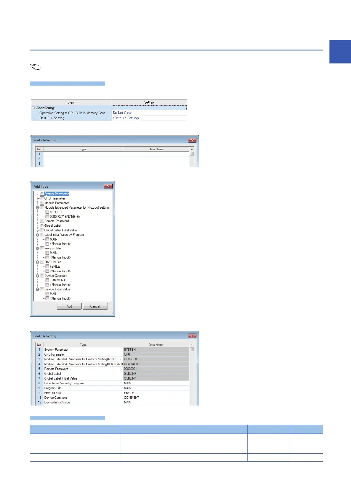 Operation Setting at CPU Built-in Memory Boot Sets whether or not to clear the CPU built-in memory (program