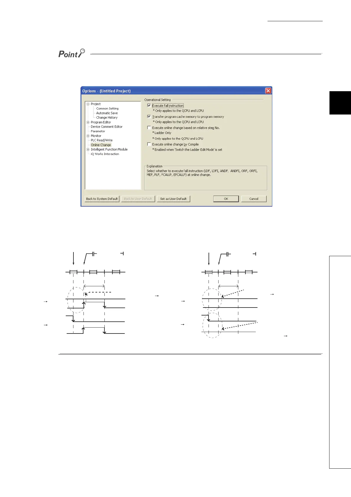 When "Execute fall instruction" is checked in the "Options" window of a programming tool, the fall instruction is executed