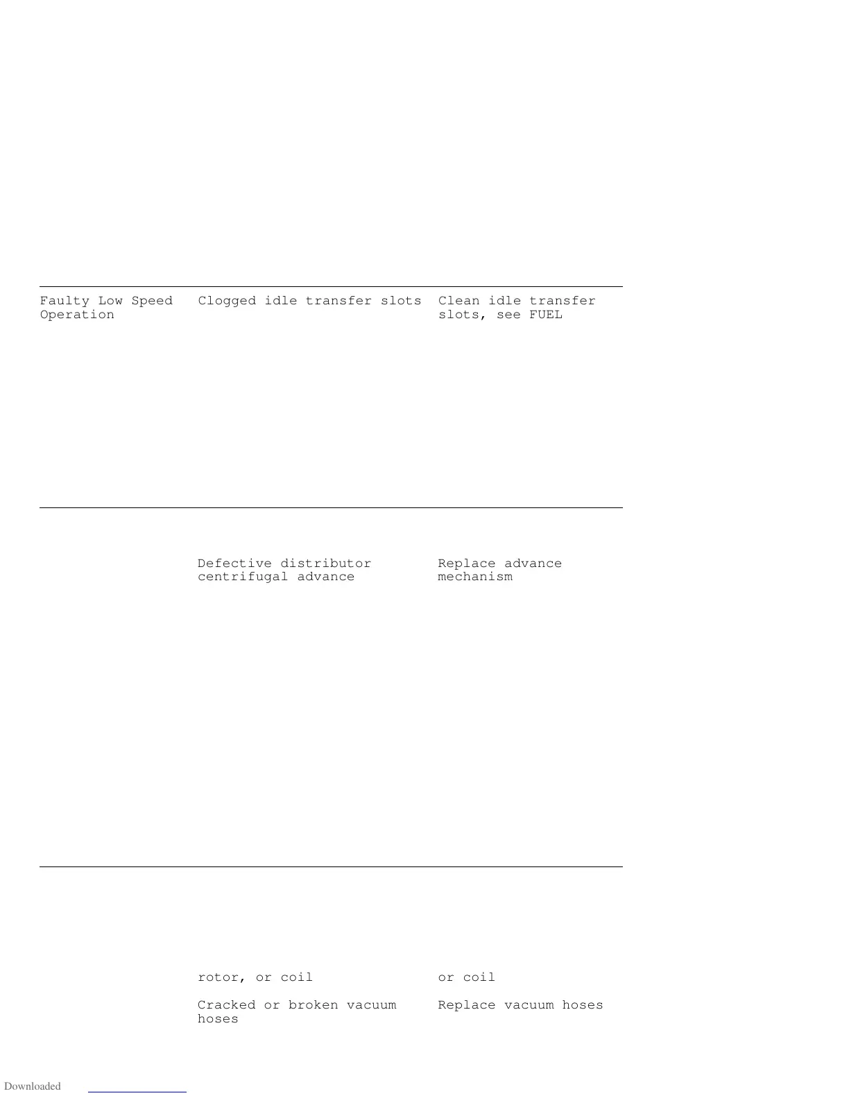 Faulty Low Speed Clogged idle transfer slots Clean idle transfer
