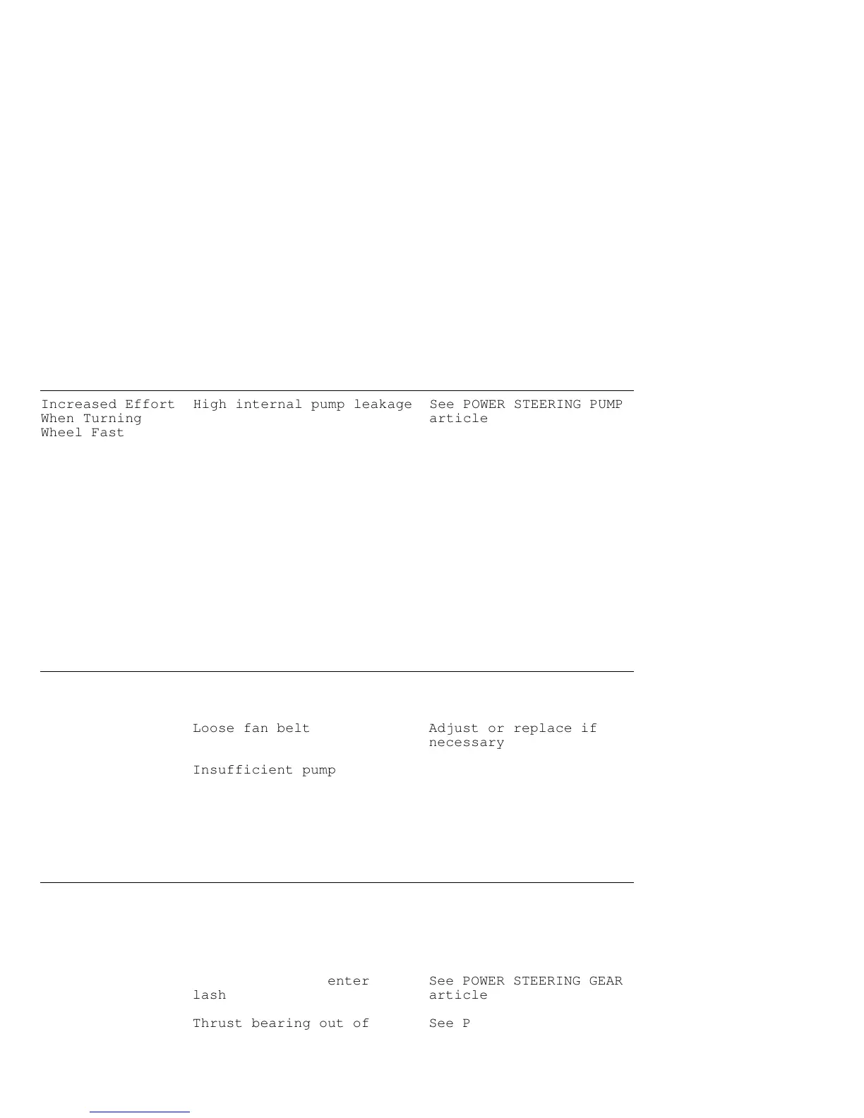 Increased Effort High internal pump leakage See POWER STEERING PUMP