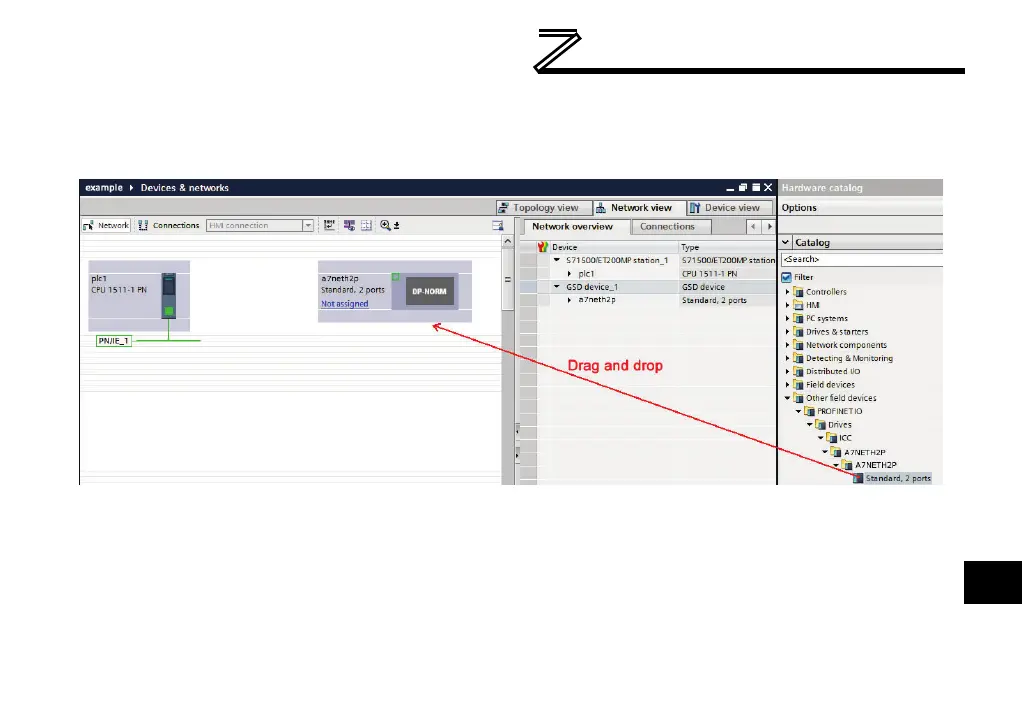 Select the device in the device tree and drag the device onto the PROFINET IO system in the