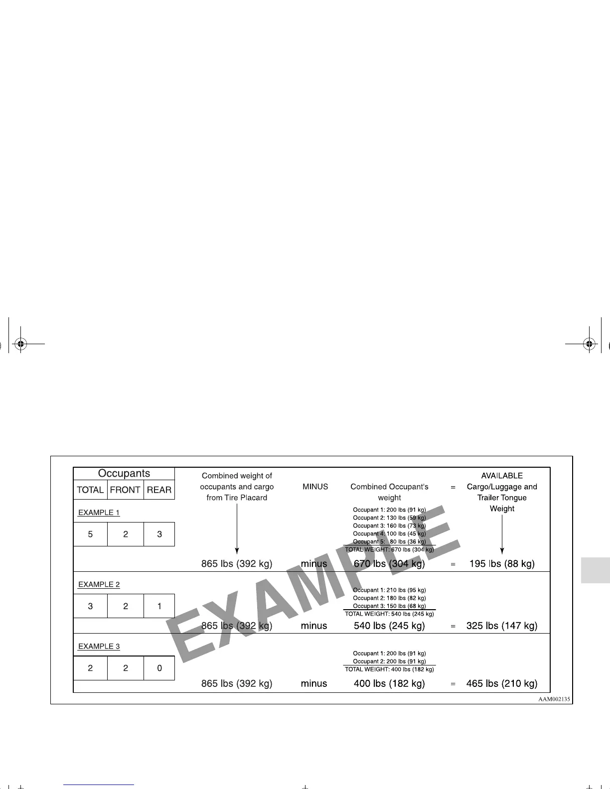 ● The following table shows examples on how to calculate total load, cargo/luggage and towing capacities of your vehicle with