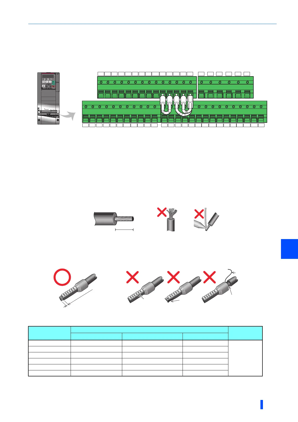 For the control circuit wiring, strip off the sheath of a cable, and use it with a blade terminal. For a single wire, strip off the