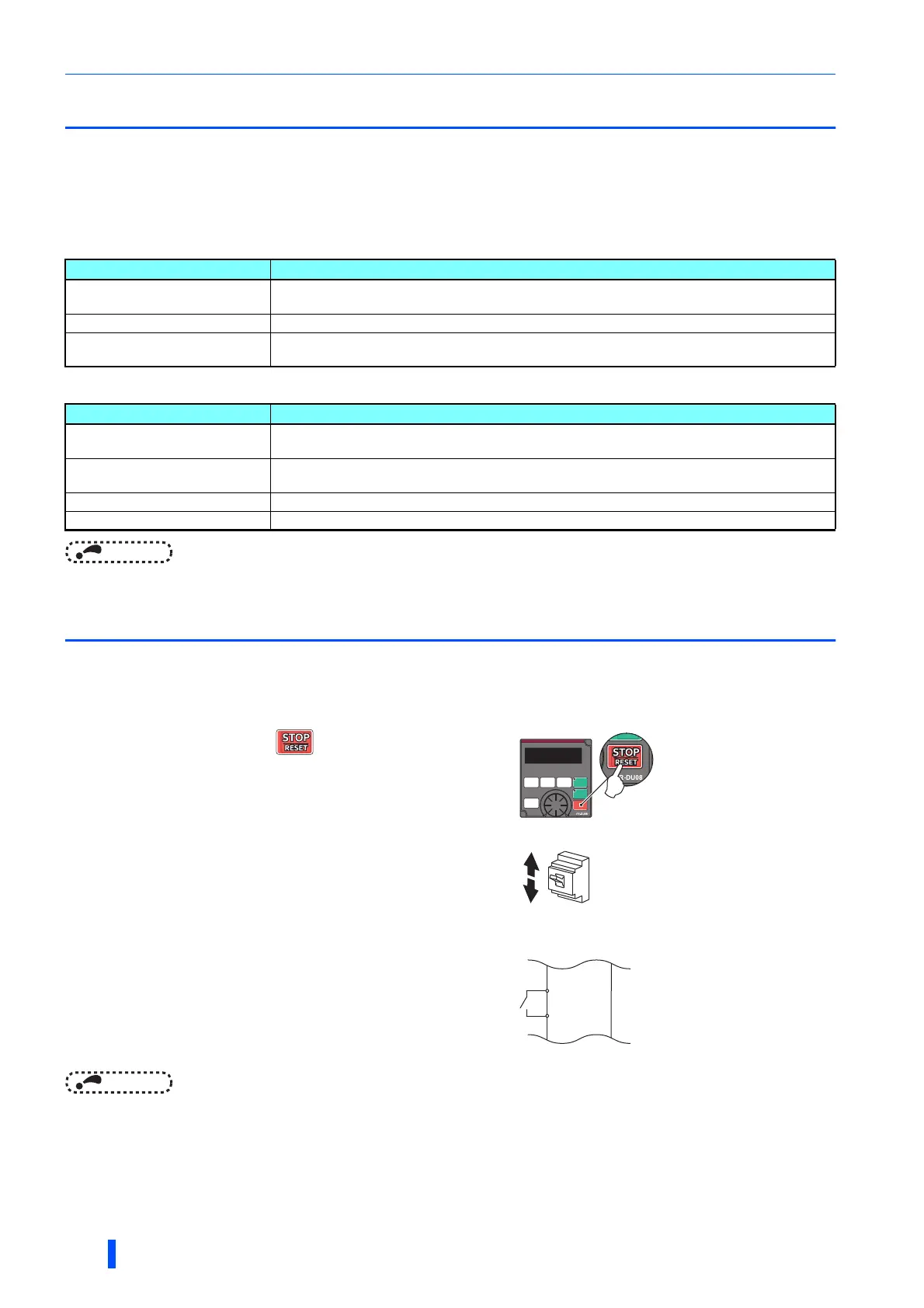 • OFF status of the start signal must be confirmed before resetting the inverter fault. Resetting an inverter fault with the start