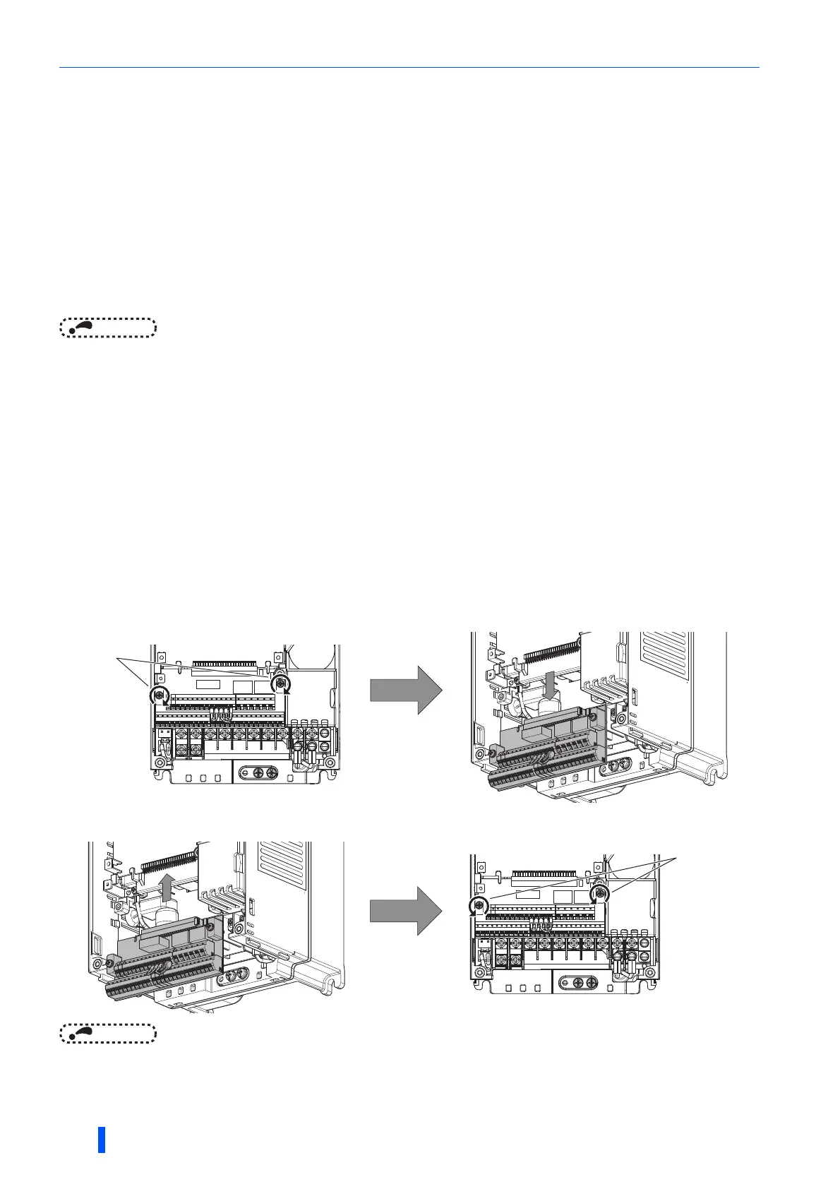 1) Loosen the two mounting screws at the both side of the control circuit terminal block. (These screws cannot be removed.)