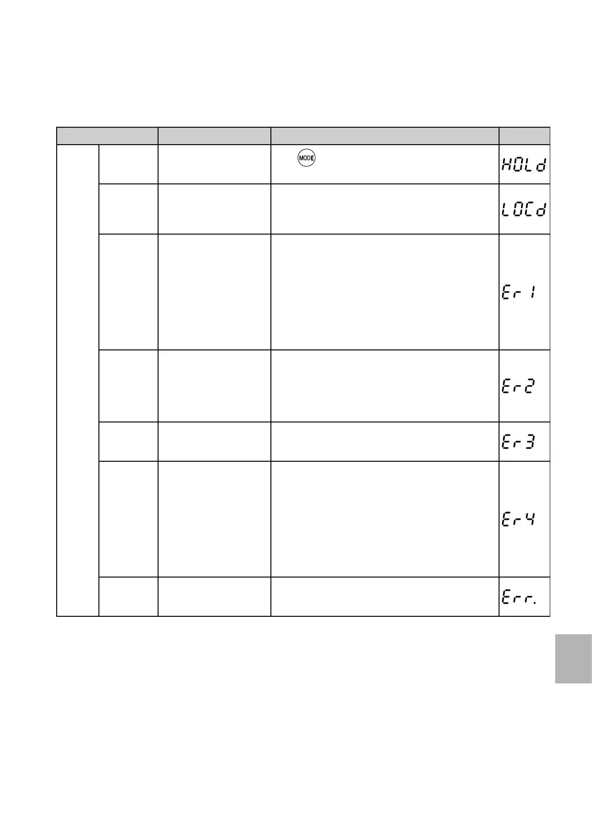 Function name Description Corrective action Display