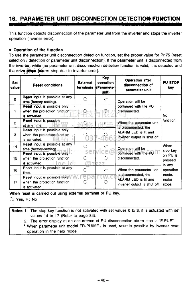 the inverter, while the parameter unit disconnection detection function is valid, it