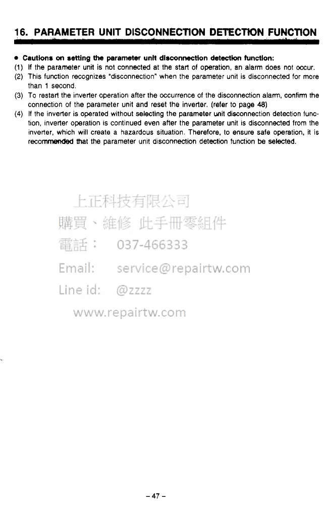 tlon, inverter operation is continued even after the parameter unit is disconnected from the