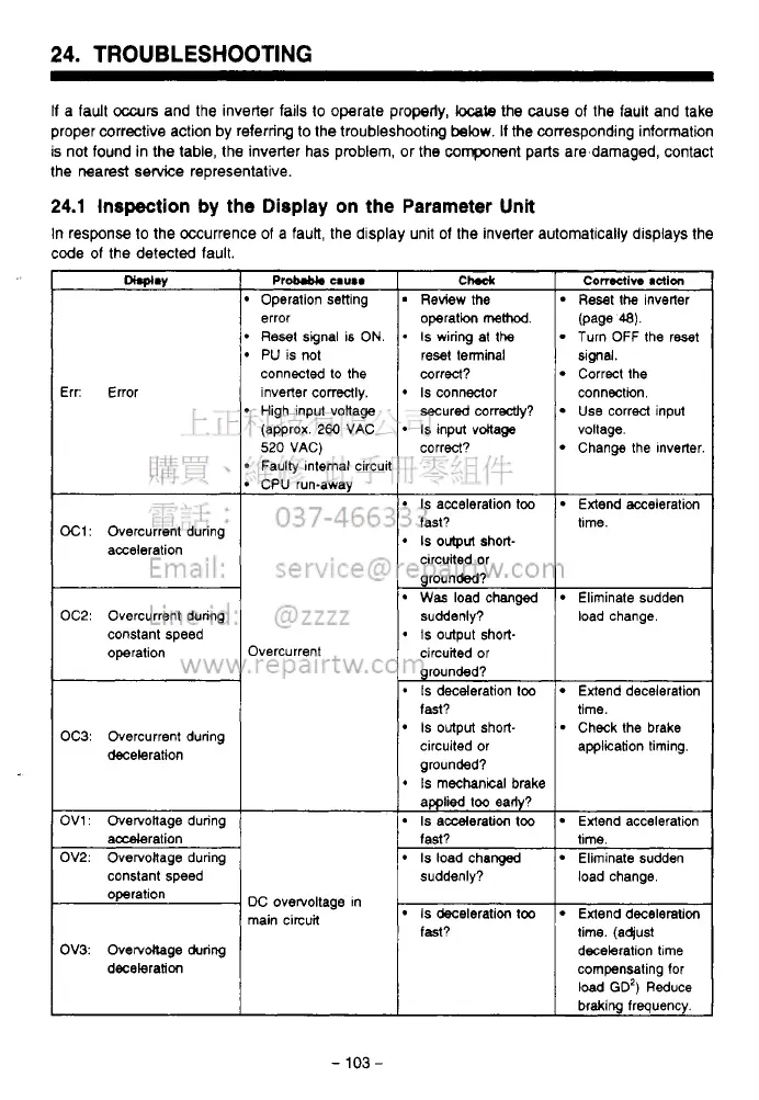 is not found in the table, the inverter has problem, or the component parts are damaged, contact