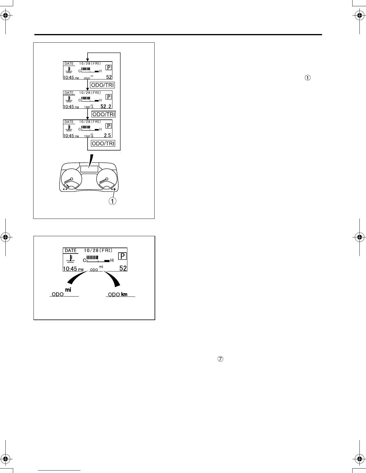 “ODO” (odometer) or “TRIP” (trip meter) is dis-