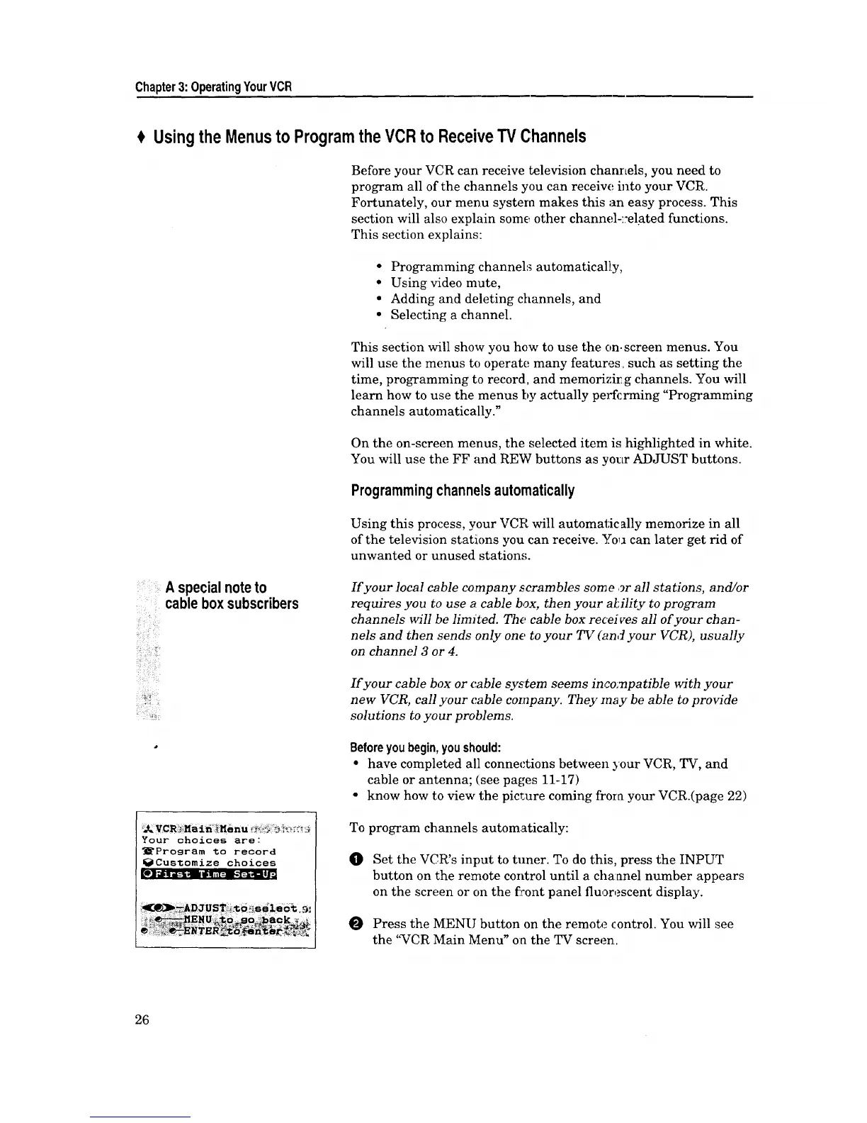 € Usingthe Menusto Programthe VCRto ReceiveTV Channels