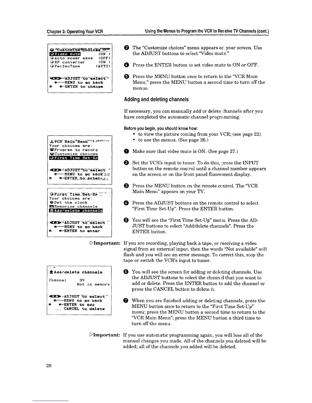 Chapter3:OperatingYourVCR Usingthe MenustoProgramtheVCRtoRec:eiveTV Channels(cont.)