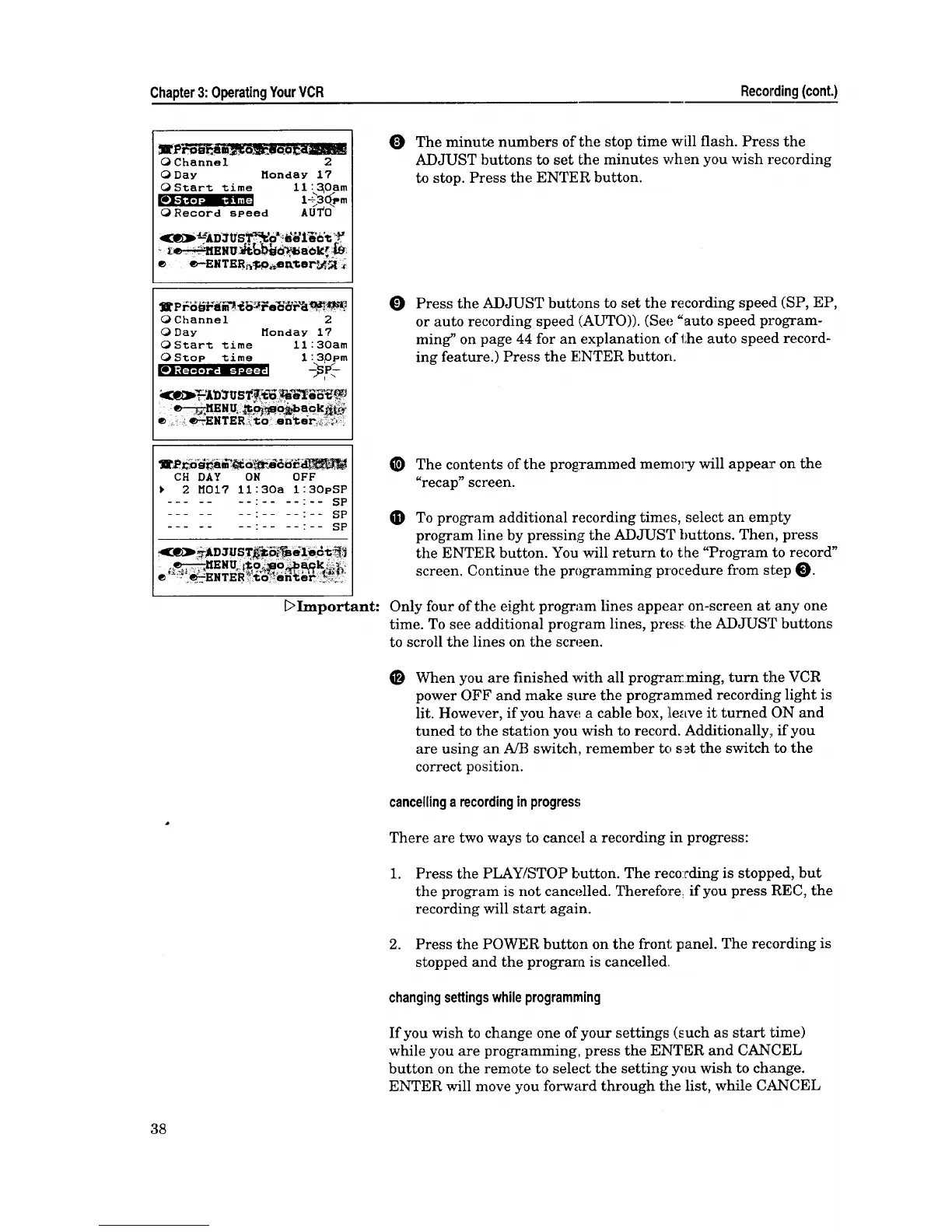 Press the ADJUST buttons to set the recording speed (SP, EP,