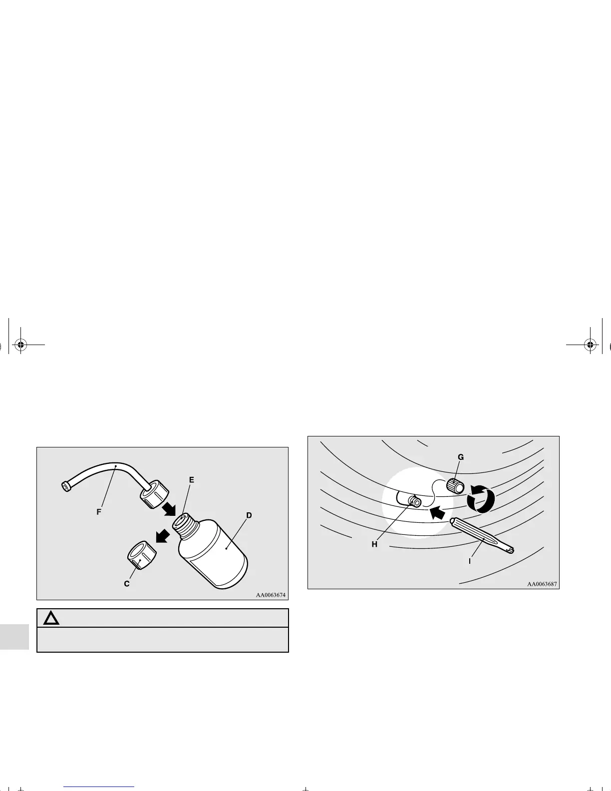 7. Take the cap (C) off the tire sealant bottle (D). Do not