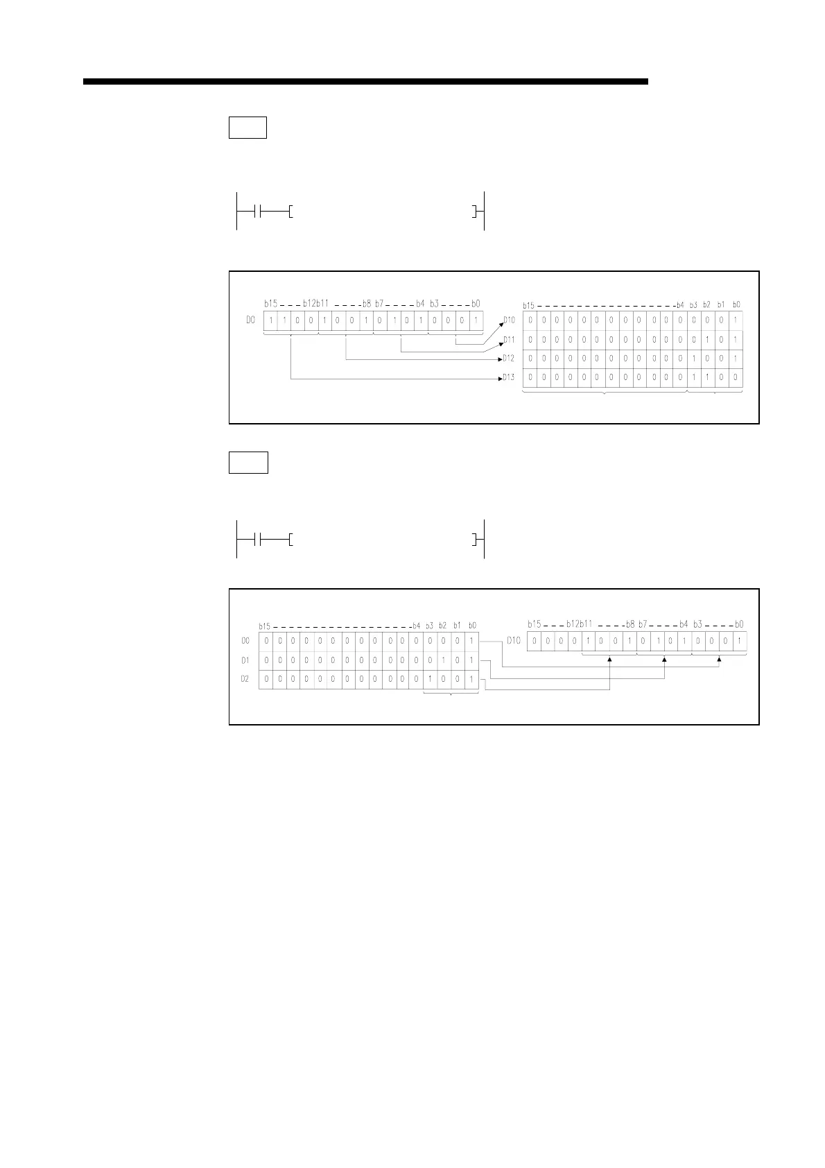 Program which stores the lower four-bit data of D0 to 2 to the D10 when X0 turns on.