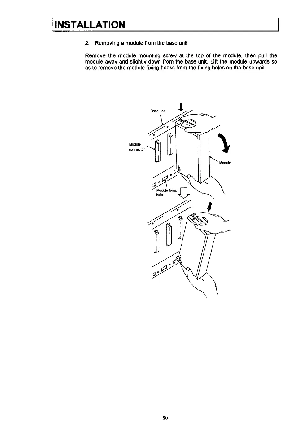 as to remove the module fixing hooks from the fixing holes on the base unit.