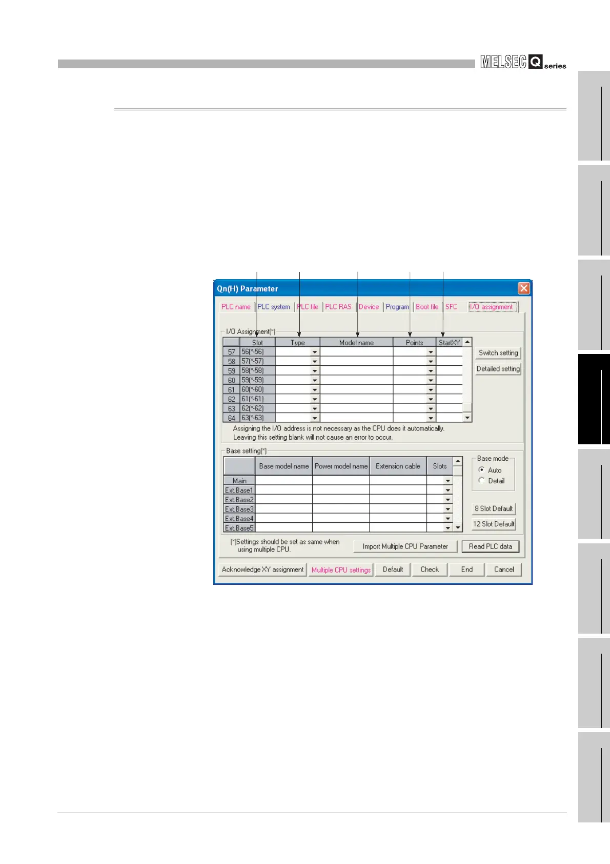 The I/O assignment is conducted at the "I/O assignment" tab screen in the "(PLC)