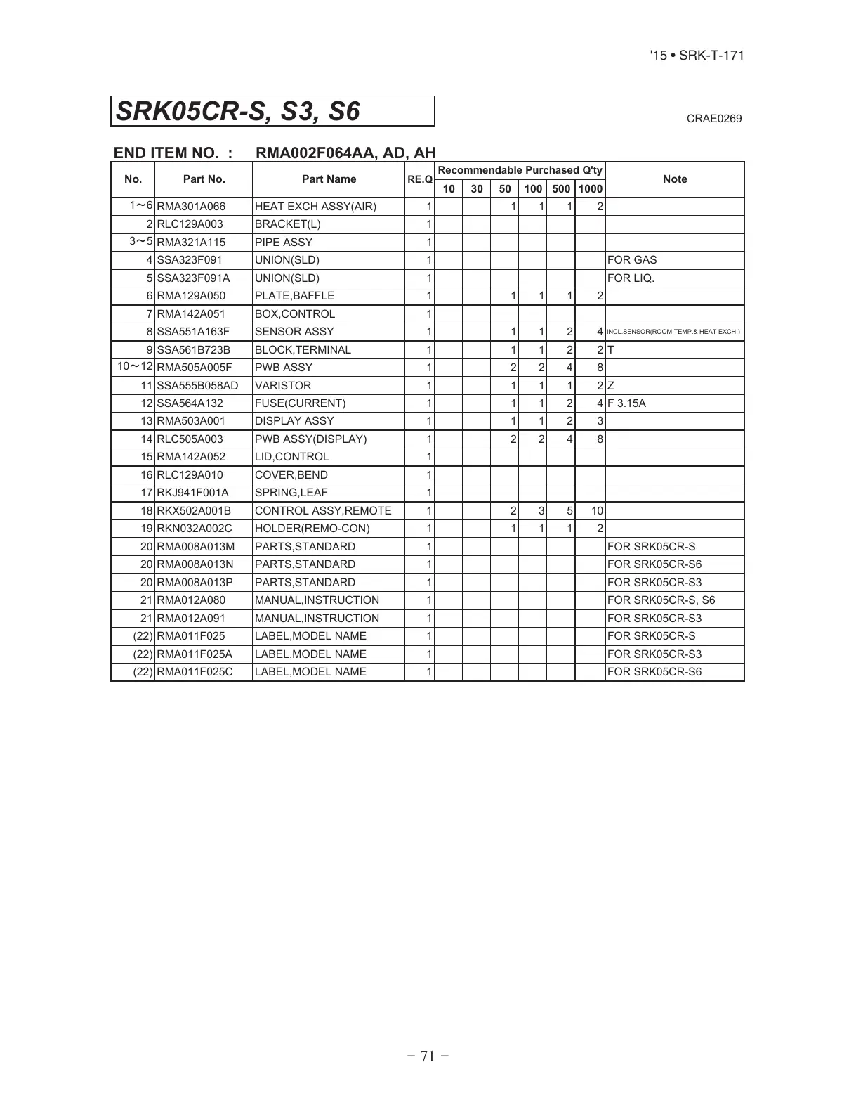 20 RMA008A013P PARTS,STANDARD 1 FOR SRK05CR-S3