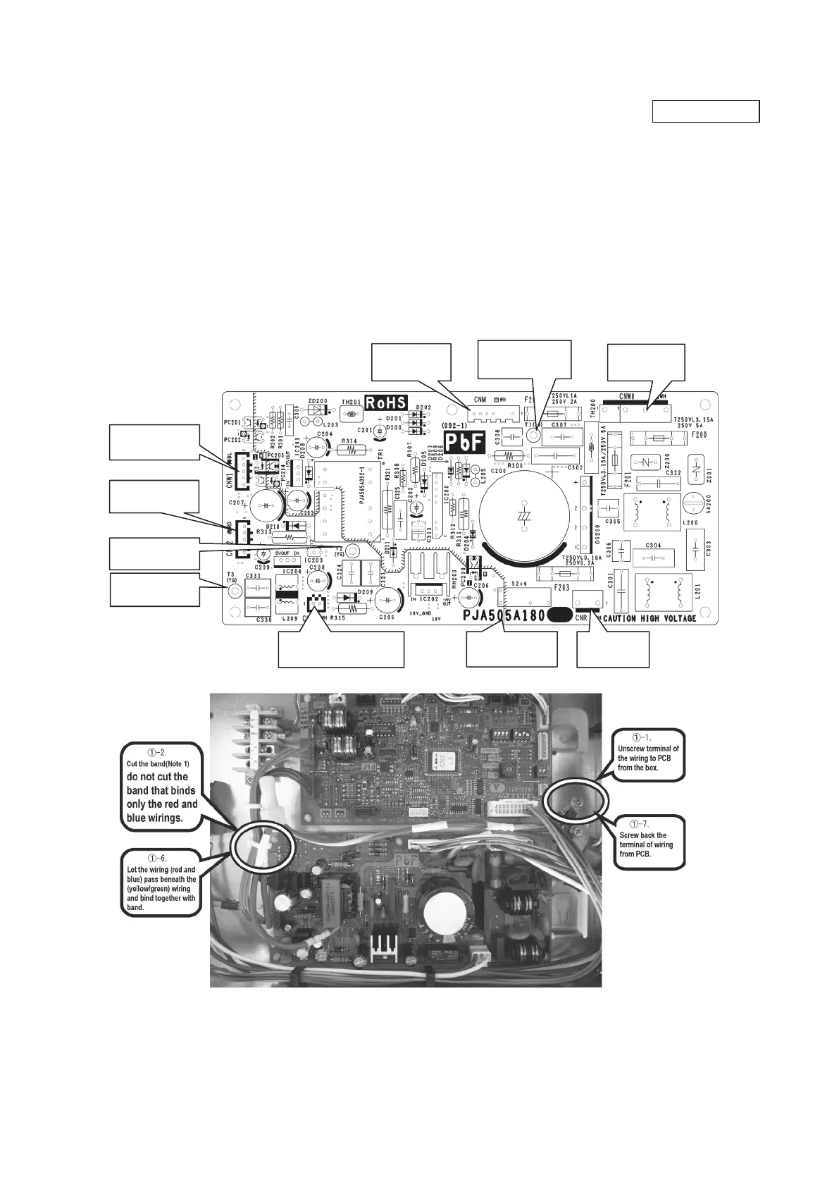 Cut the band that binds the wiring (red and blue) from connector CNW1 and CNW2, and the wiring (yellow/green) from PCB (T2/T3) . (Note 1)