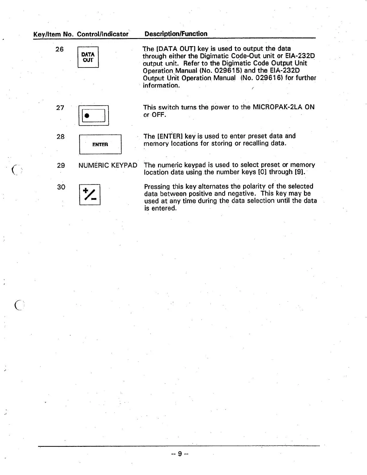 Keylltem No. Controlllndicator DescriptionIFunction