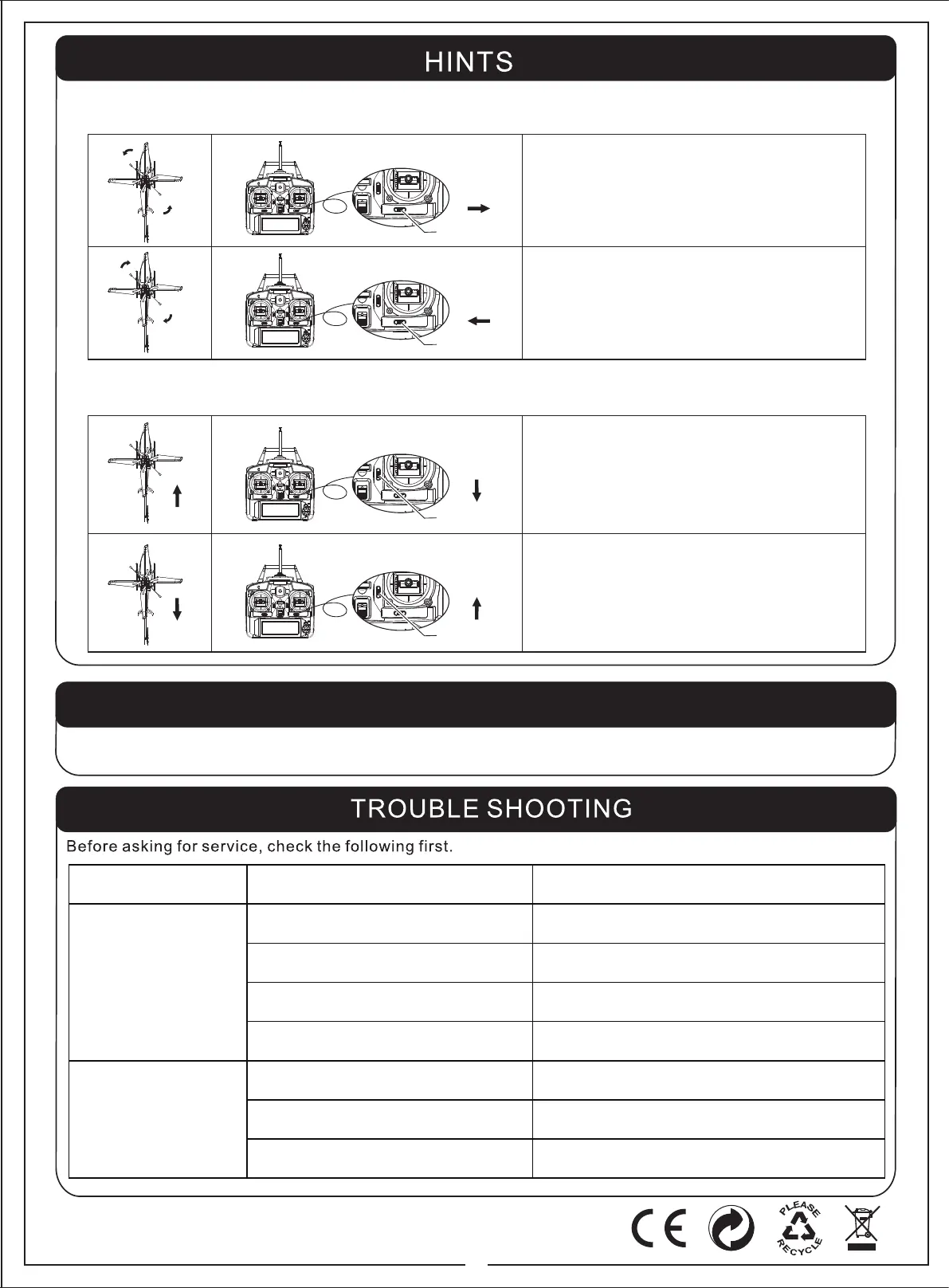 When the battery voltage of the helicopter drops to certain level, the helicopter will be out of control. Recharge is necessary to