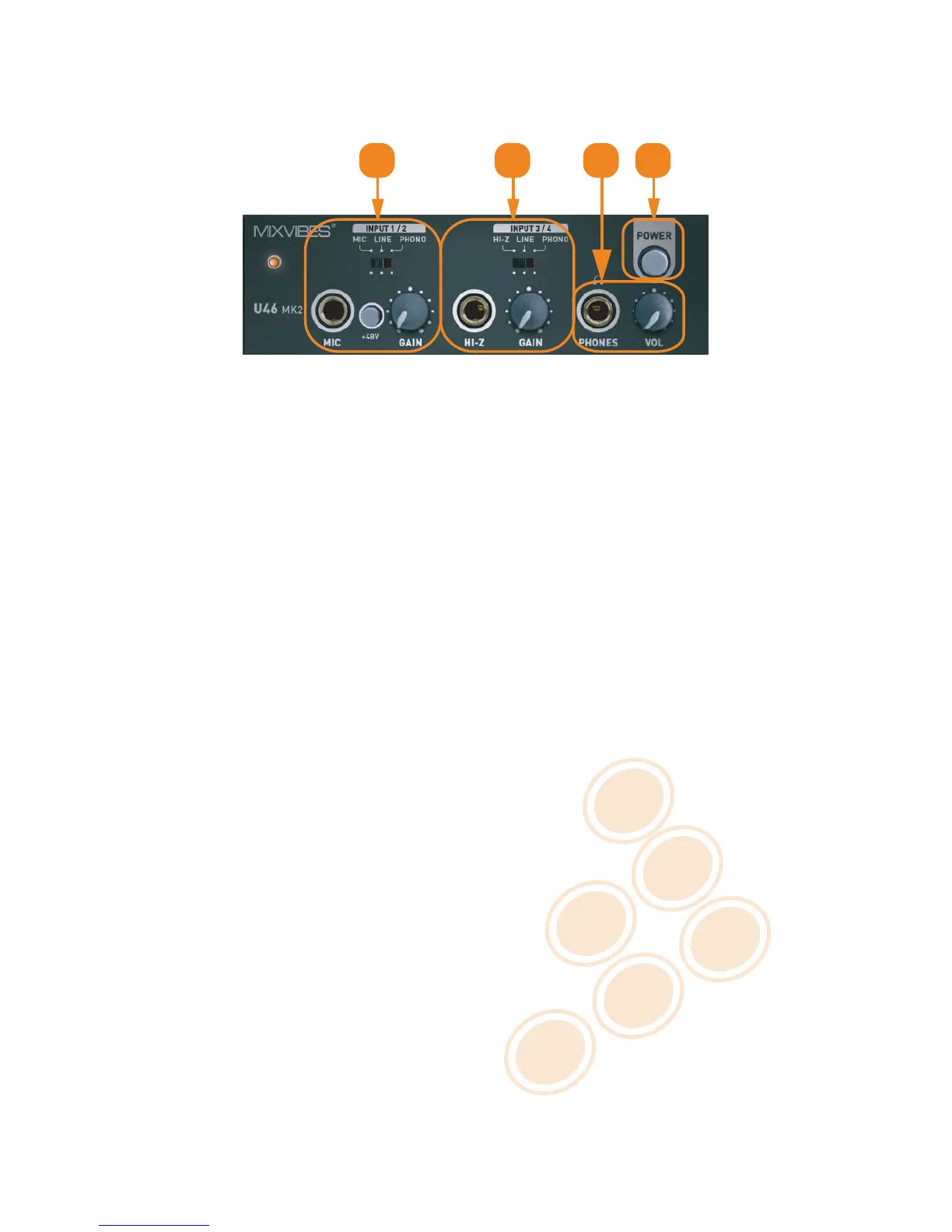 Input source (MIC/LINE/PHONO) selector: This is where you select input sources of channel 1/2.