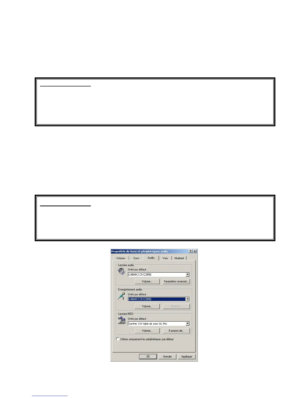 Audio -> Onglet ‘Audio’. Sélectionnez le pilote U46MK2 comme unité par défaut pour