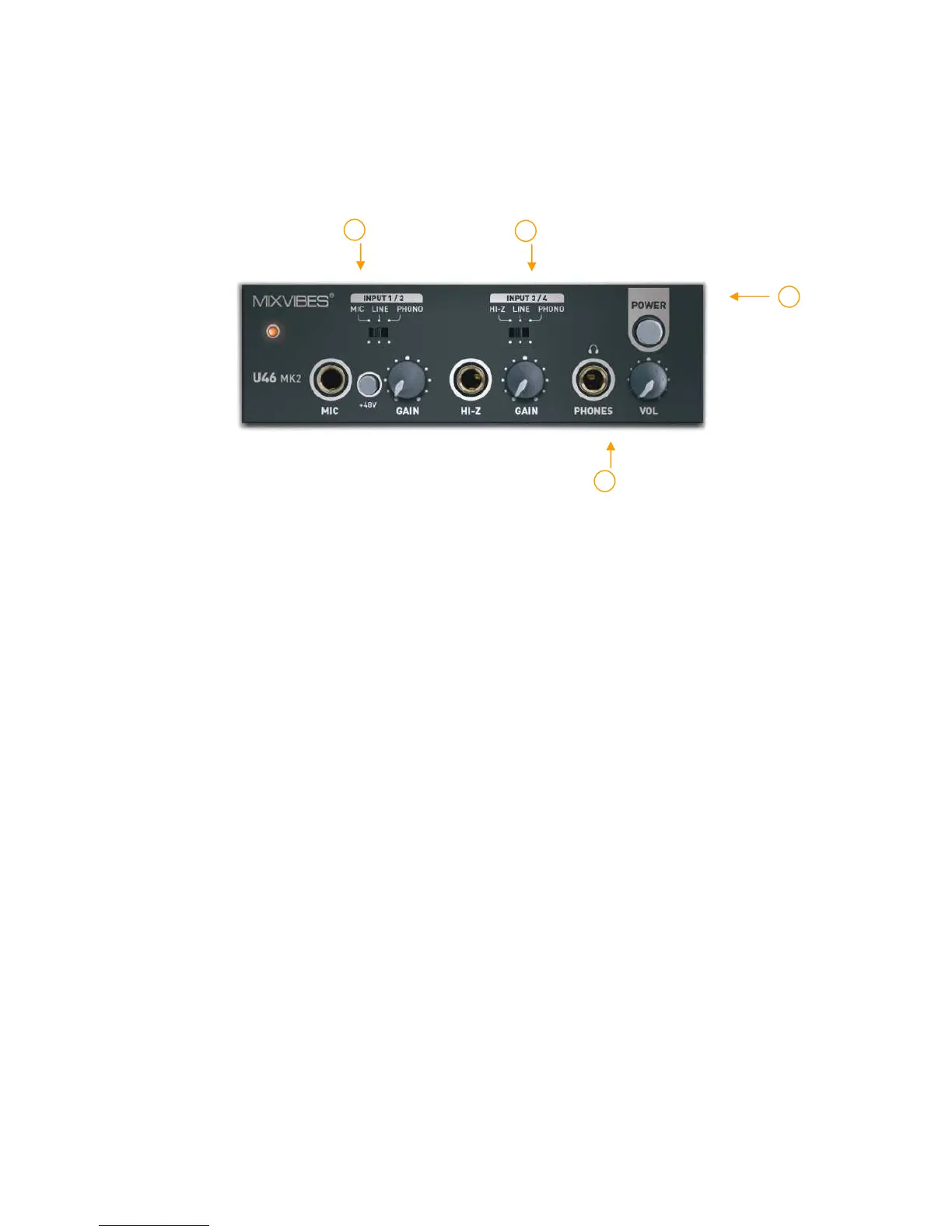 - +48V Phantom power switch: Supply +48V DC phantom power to input channels 1/2