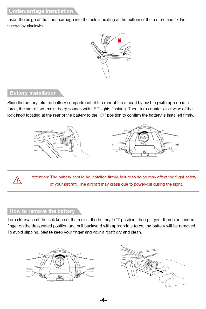 Attention: The battery should be installed firmly, failure to do so may affect the flight safety