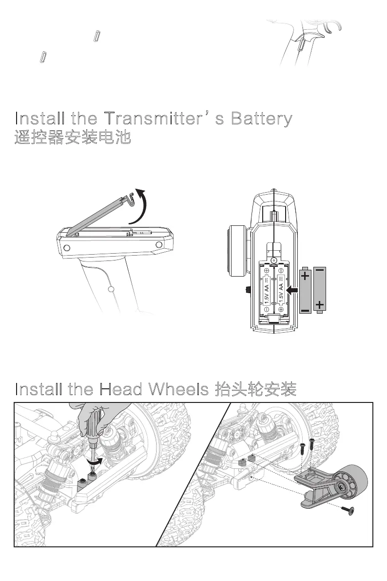 Open the transmitter’s battery cover, insert 2 AA batteries according to the