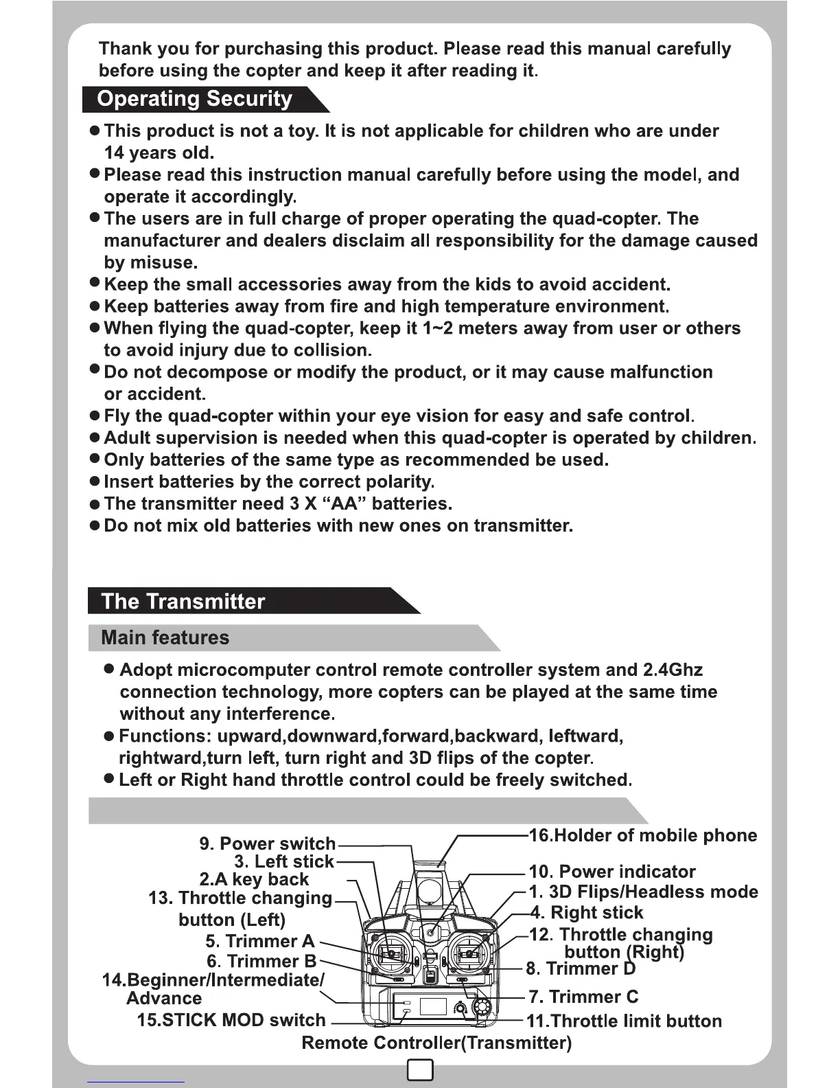 MJX X300C - Safety and Operational Guidelines; General Safety Precautions; Transmitter Overview and Controls; Transmitter Key Features