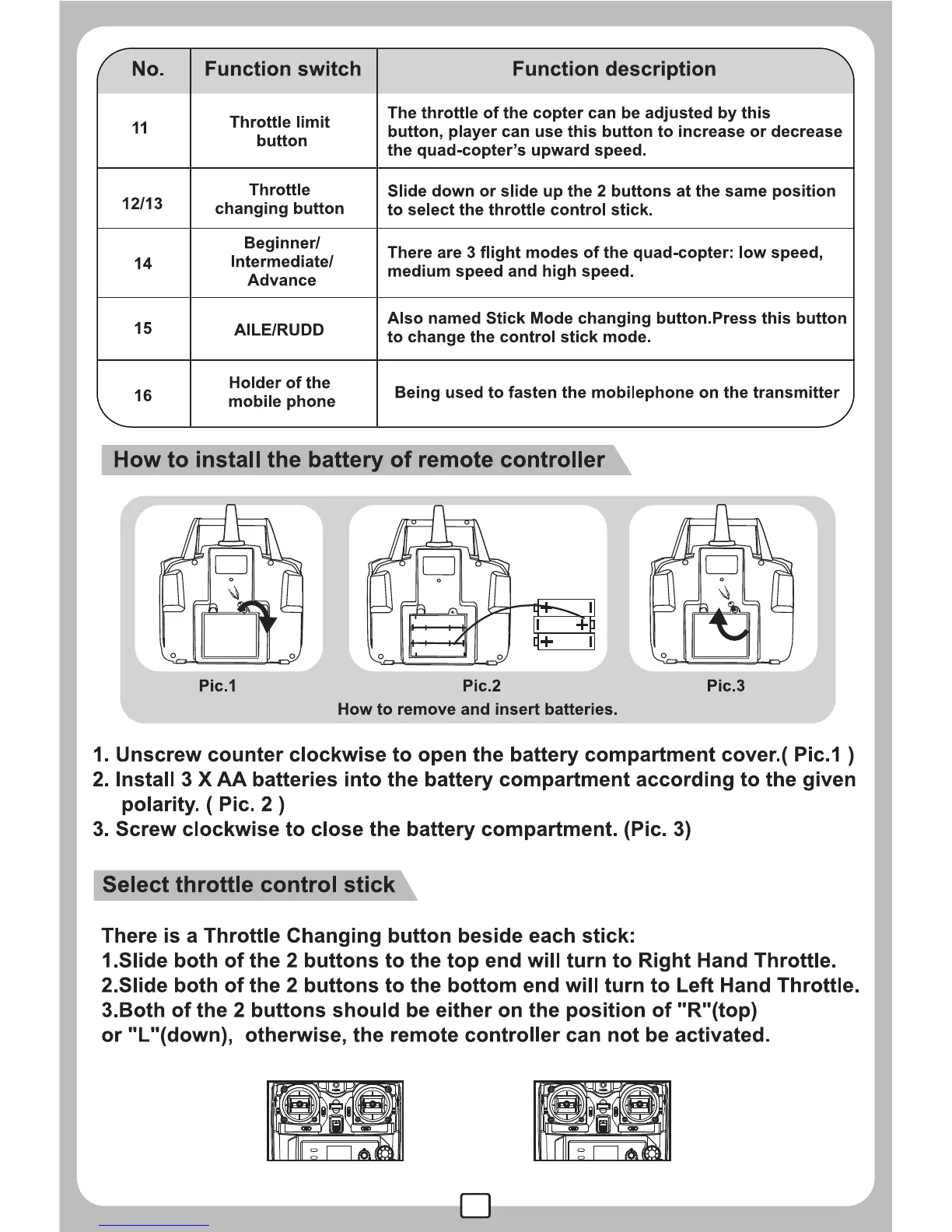 MJX X300C - How to Install the Battery of Remote Controller; Select Throttle Control Stick