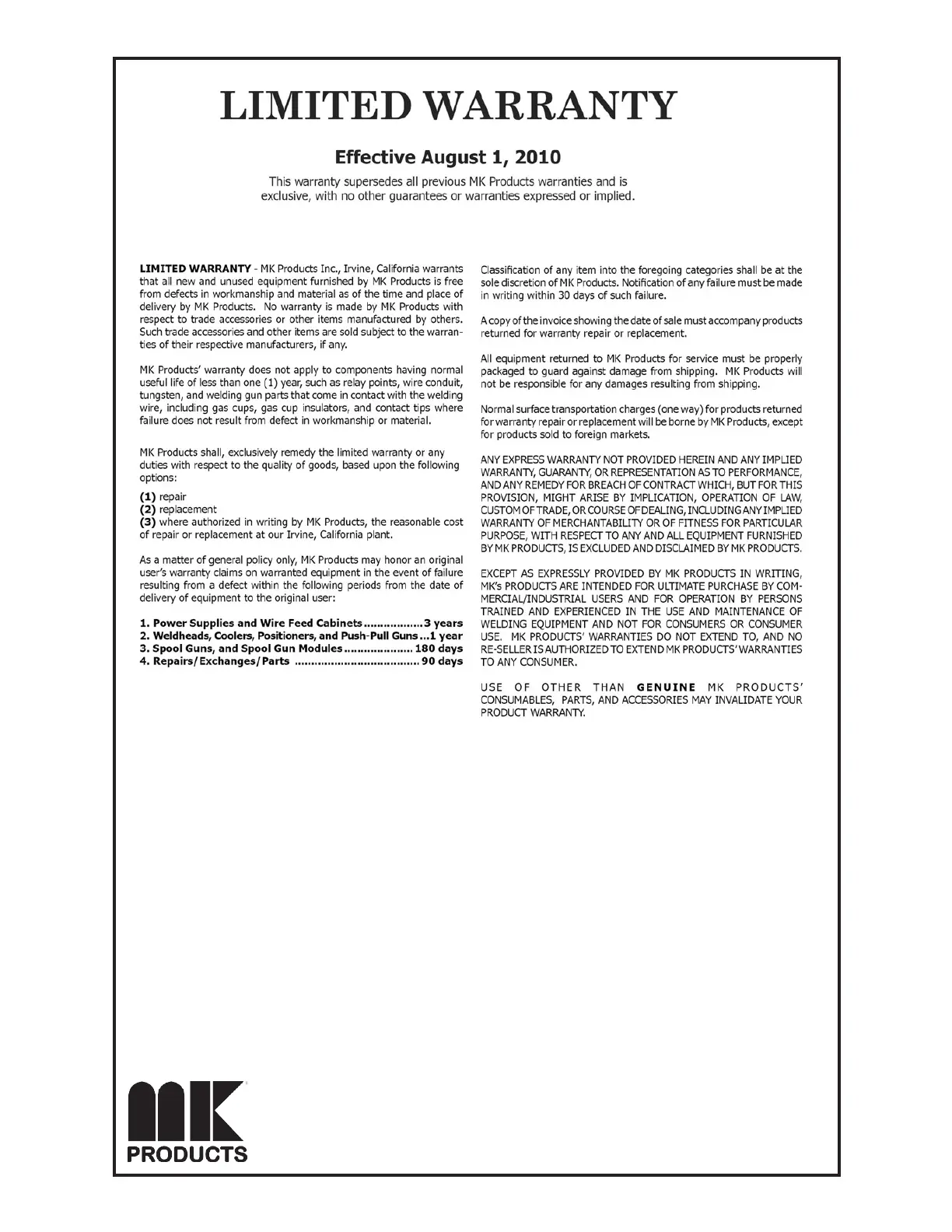 MK Products Cobramatic Pro Series - Limited Warranty; Warranty Terms and Conditions
