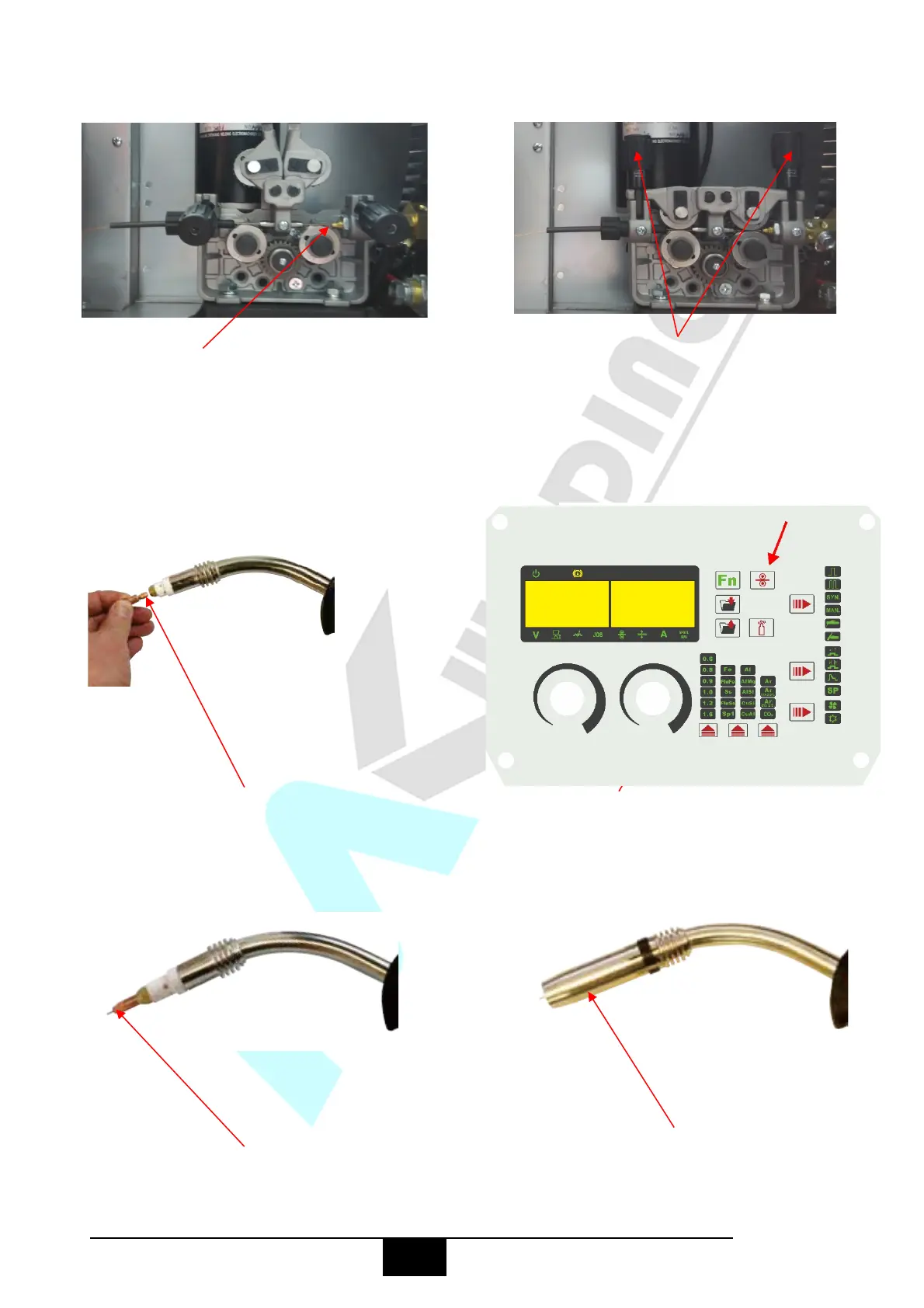(12) Remove the gas nozzle and contact (13) Press and hold the manual wire button